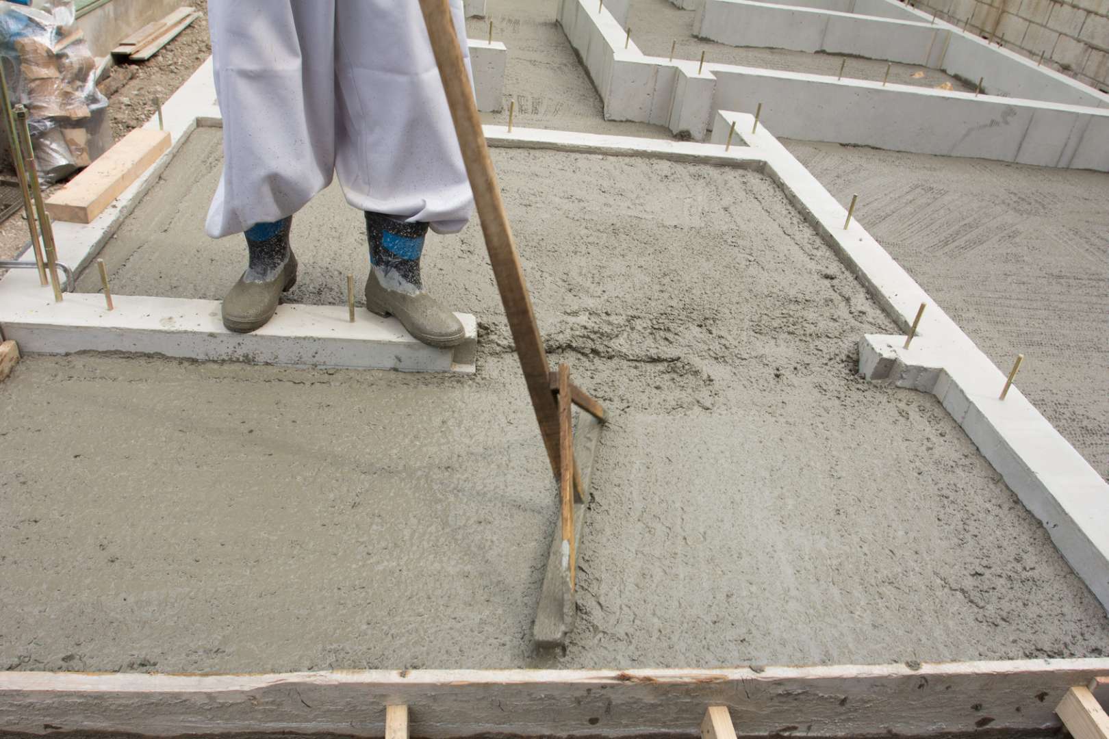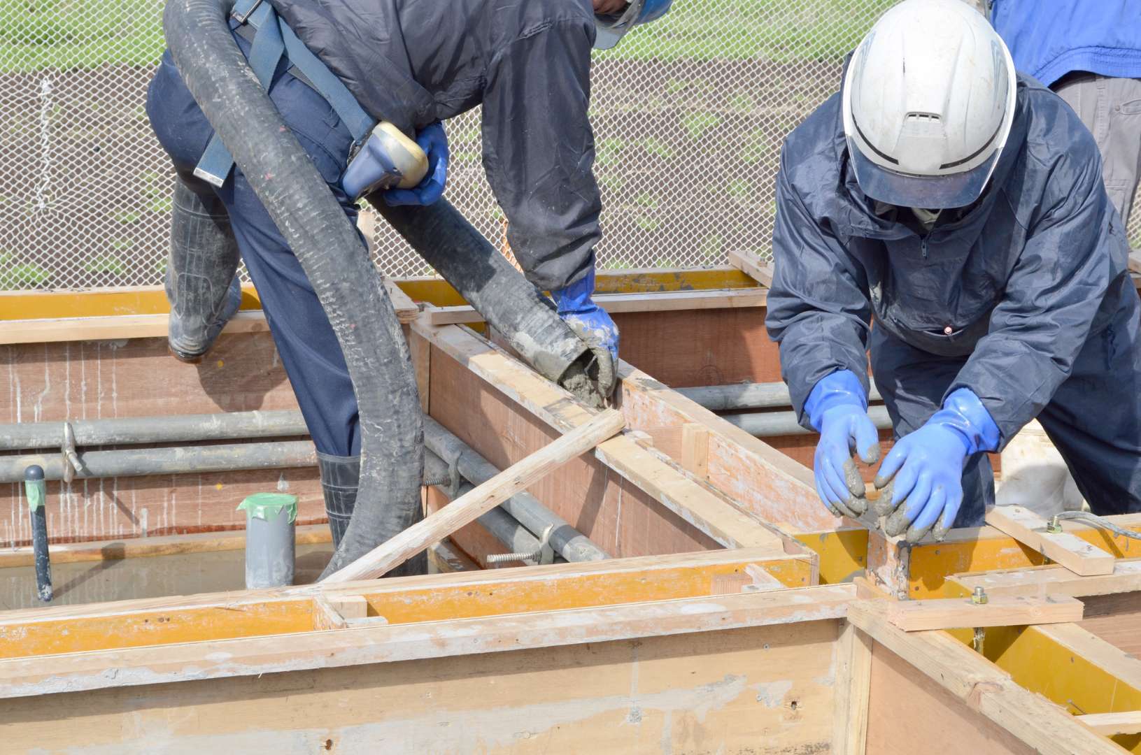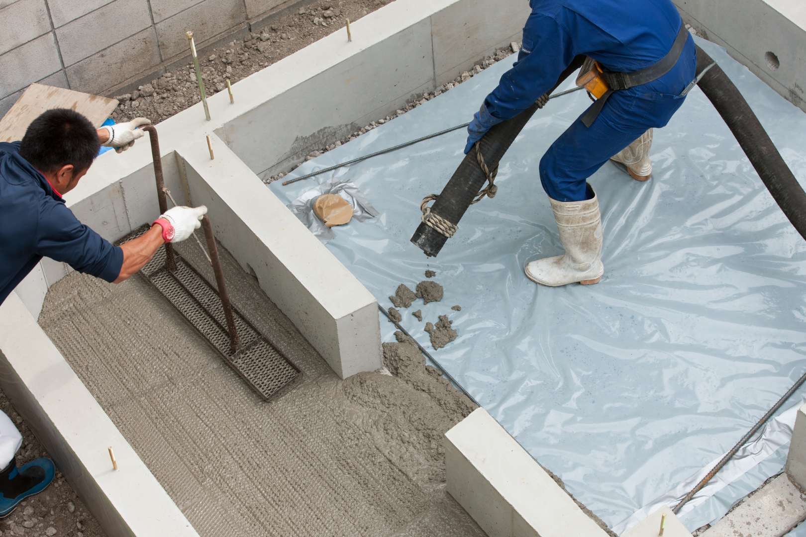 平らな床部分と、壁となる立ち上がり部分に分けて流し込み、内部に空気が残らないように隅々まで行き渡らせるのが、強度を確保するためのポイントです。
